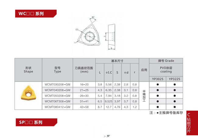 | YP3125 | 2-4um ALCr+ALCrSiN PVD涂層,結(jié)合超細(xì)顆粒高韌性基體,適合所有材料,不銹鋼、鋼、鑄造合金精加工、半精加工 | P10-P25 K15-K30 M10-M25 |